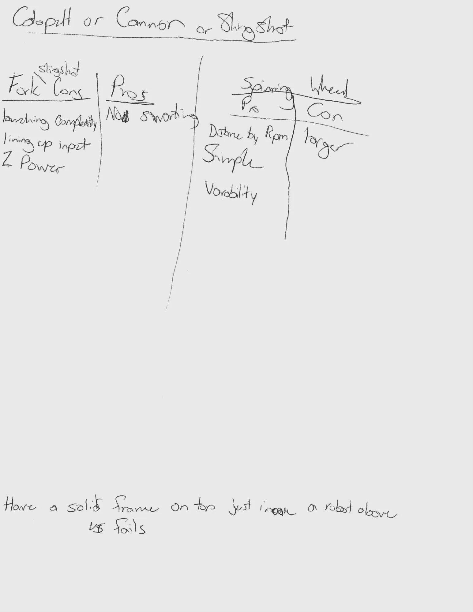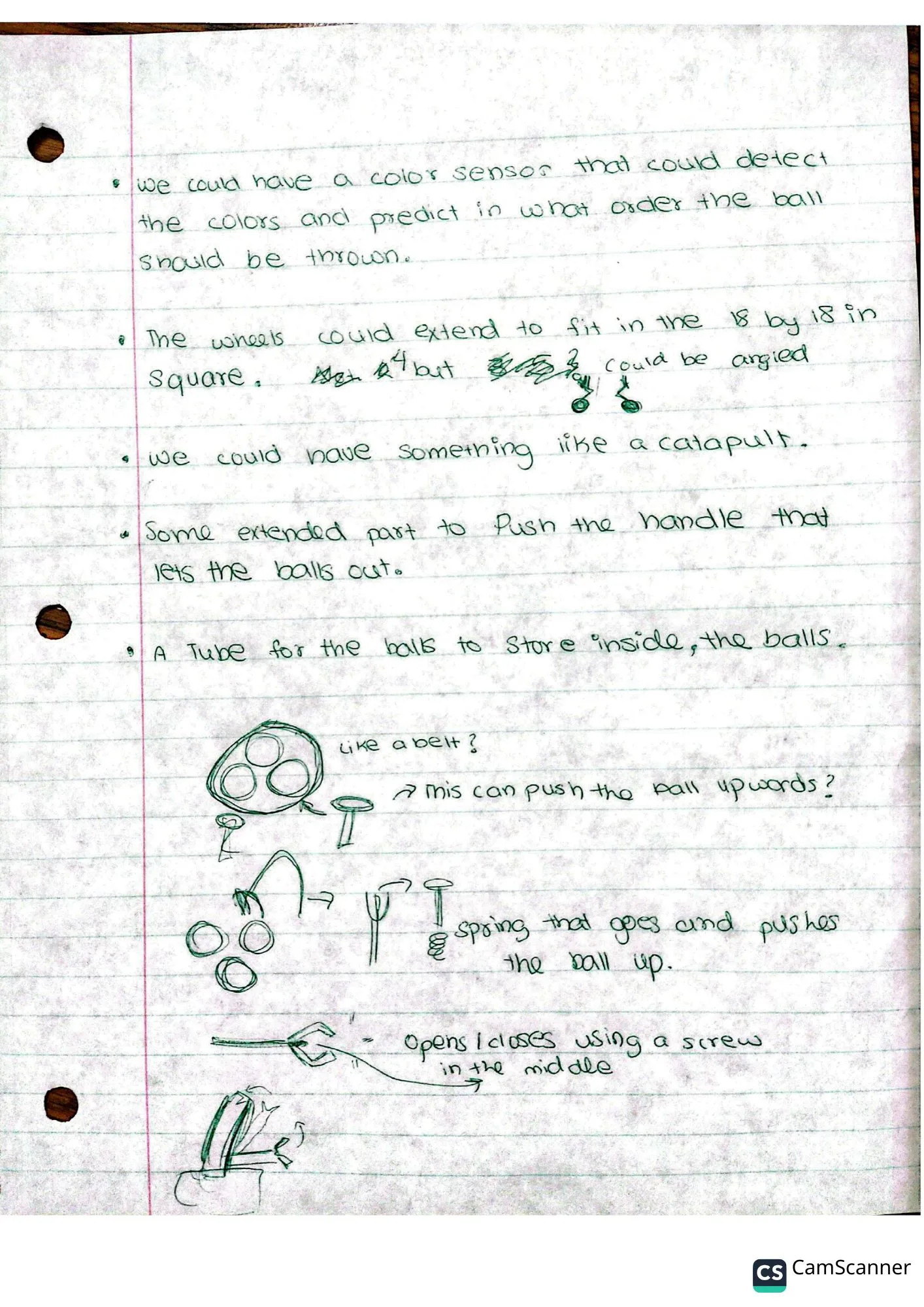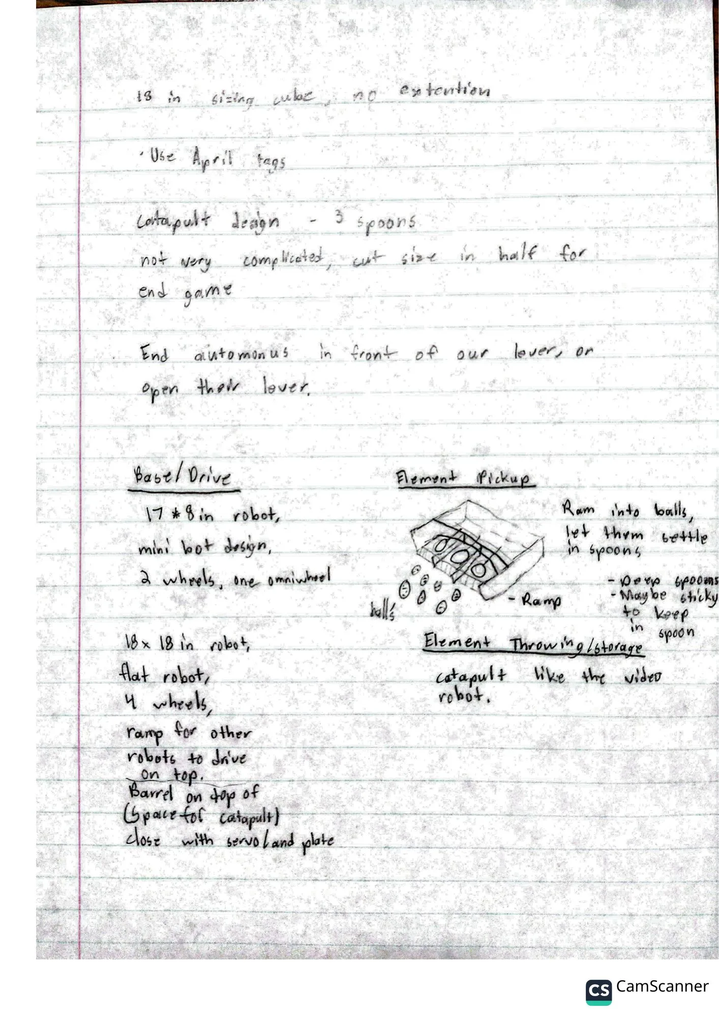 After attending the DECODE kickoff event, the next practice consisted entirely of a brainstorming session. The team threw out ideas for Base/Drive,Element Pickup, Element Throwing, Element Storage and Control. These items coincide with the point award system during each match.