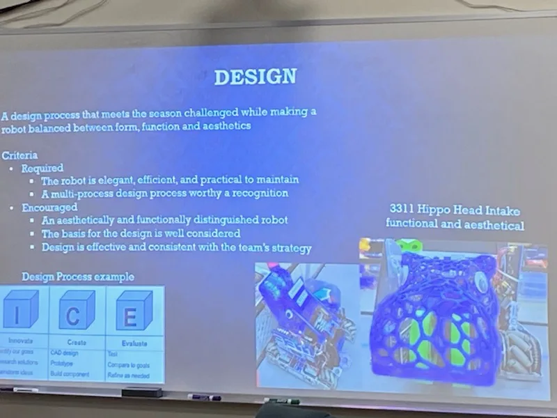 Design Process Notes: At this year of kickoff there was very little discussion on how to approach the assignment. Instead, we learned a lot form what Team 3311 does to prepare for the year. Considering that they competed well at state, we should take their process and implement as much as possible. Below are some notes that Gavin and Nick took.
