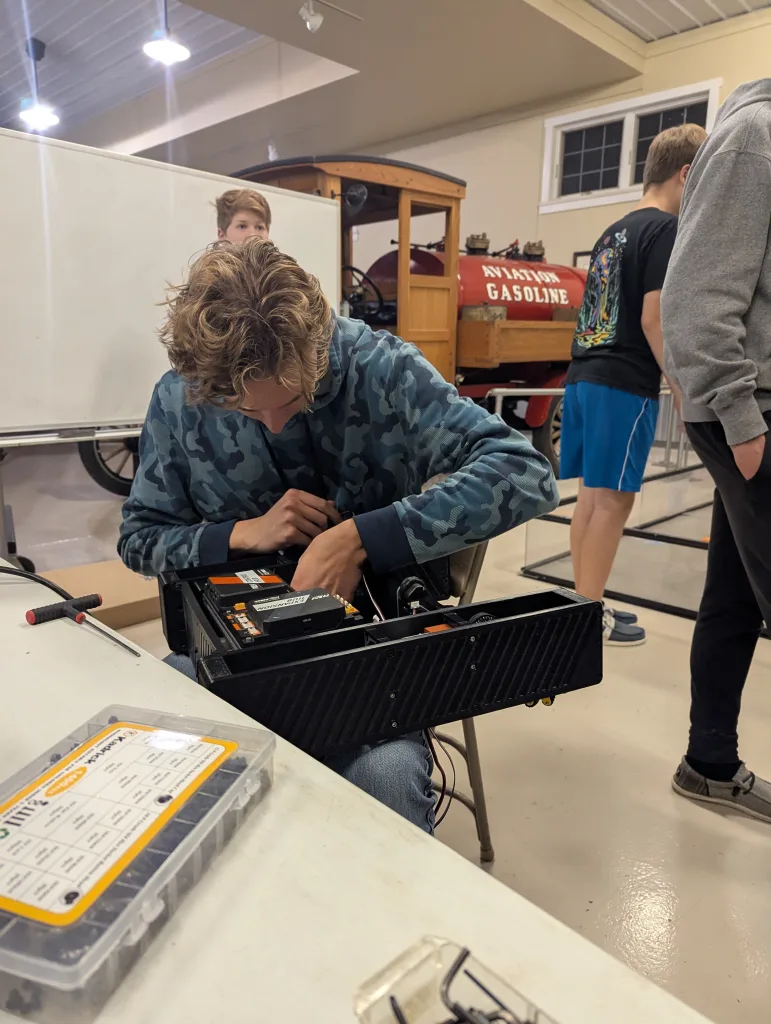 Grayson, Maddox, Jude and Coach Dave started assembly of the DECODE field in the WACO hanger