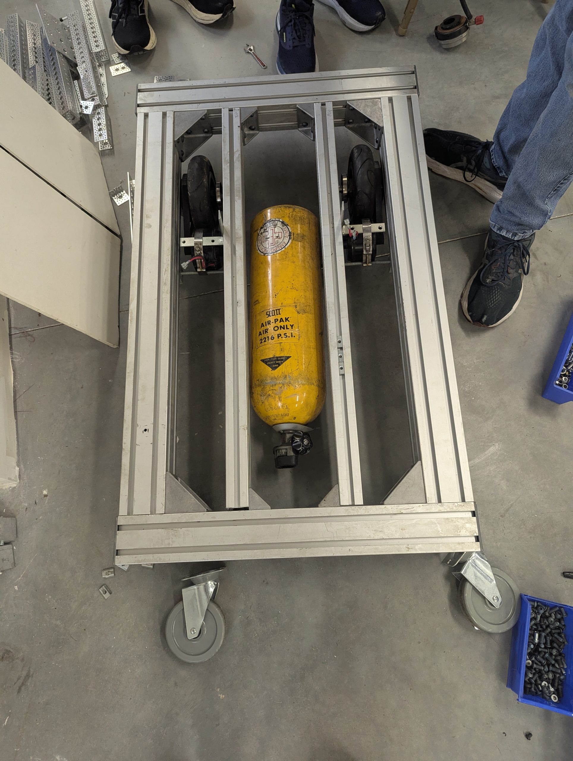 This design then transitioned into reusing the firefighters backpack tank frame and attached to the robot frame. This allows the air tank to be securely strapped on the robot frame during movement. The tank was mounted horizontally on the frame instead of resting within the original frame design to allow for easier access to hookup and the shutoff valve.