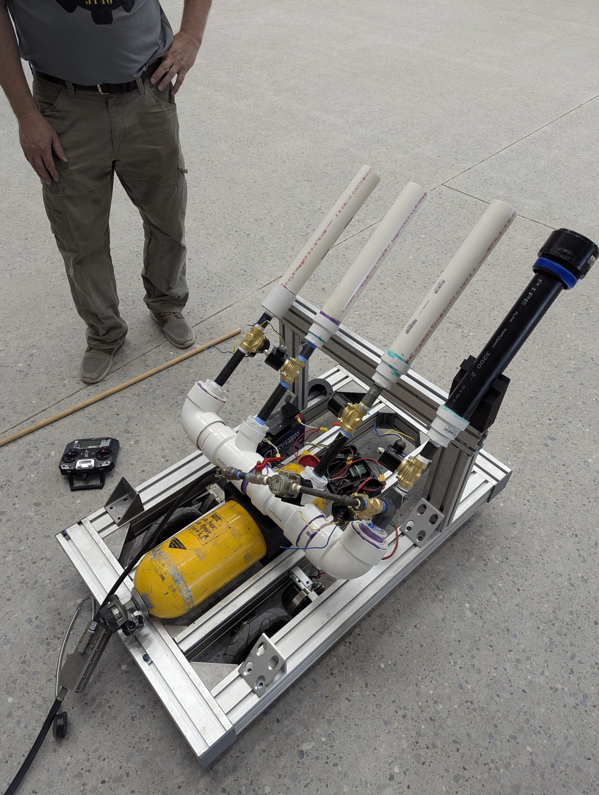 The air is stored in the tank with a switch from the operator. From there any of the barrels can be fired. Unfortunately, the robot is not equipped with semi-automatic firing. After every shoot the operator must reload the tank.