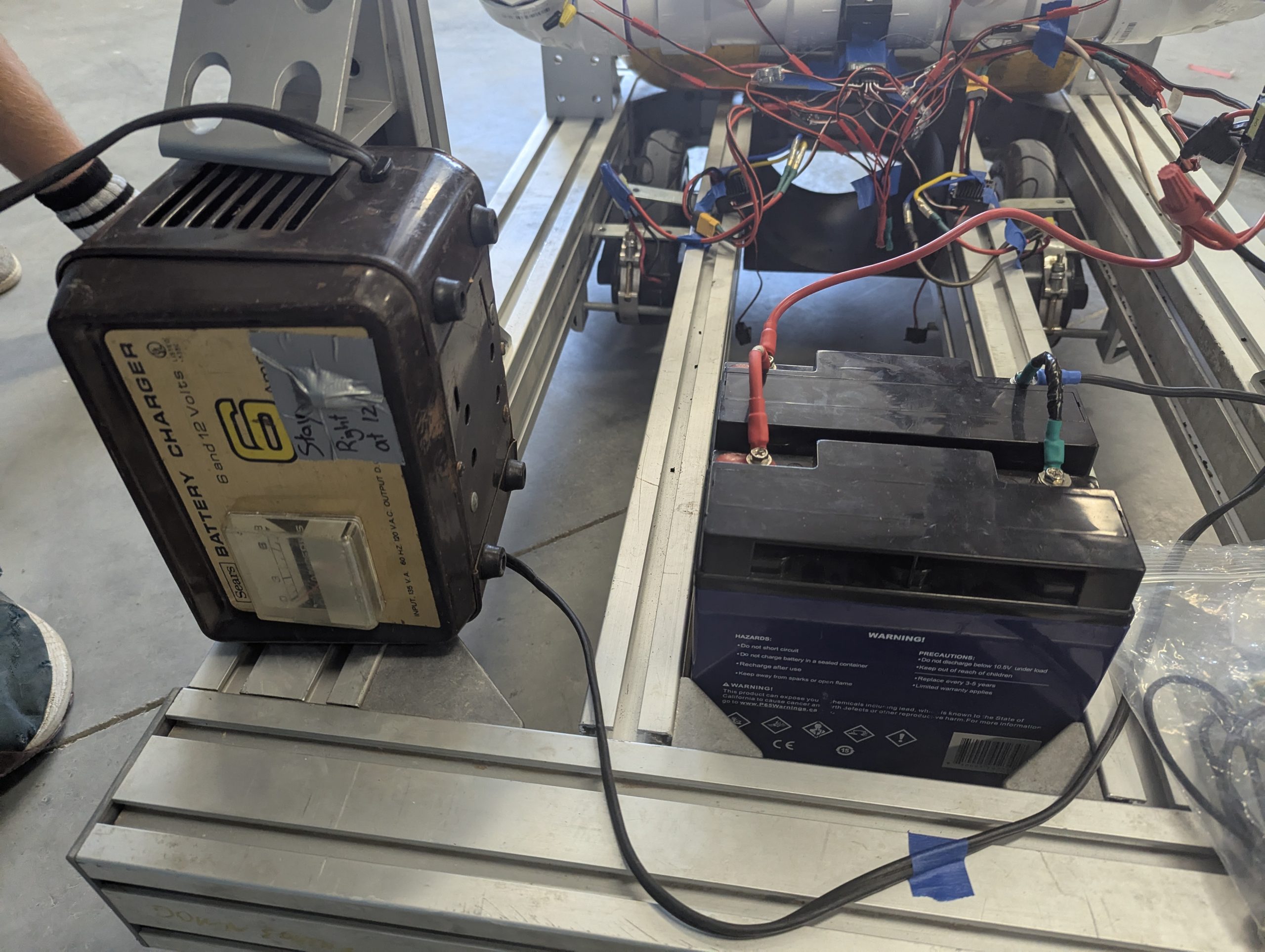 Testing revealed that one 12v battery was not able to provide enough duration for 20+ minutes of use. A second 12v lead-acid battery was wired in parallel to double the amp-hours. A battery charger was wired into the two batteries to provide a ready source for re-charging the batteries by just plugging into the wall. The battery charger provides a 6amp charge with auto-shutoff to the batteries.