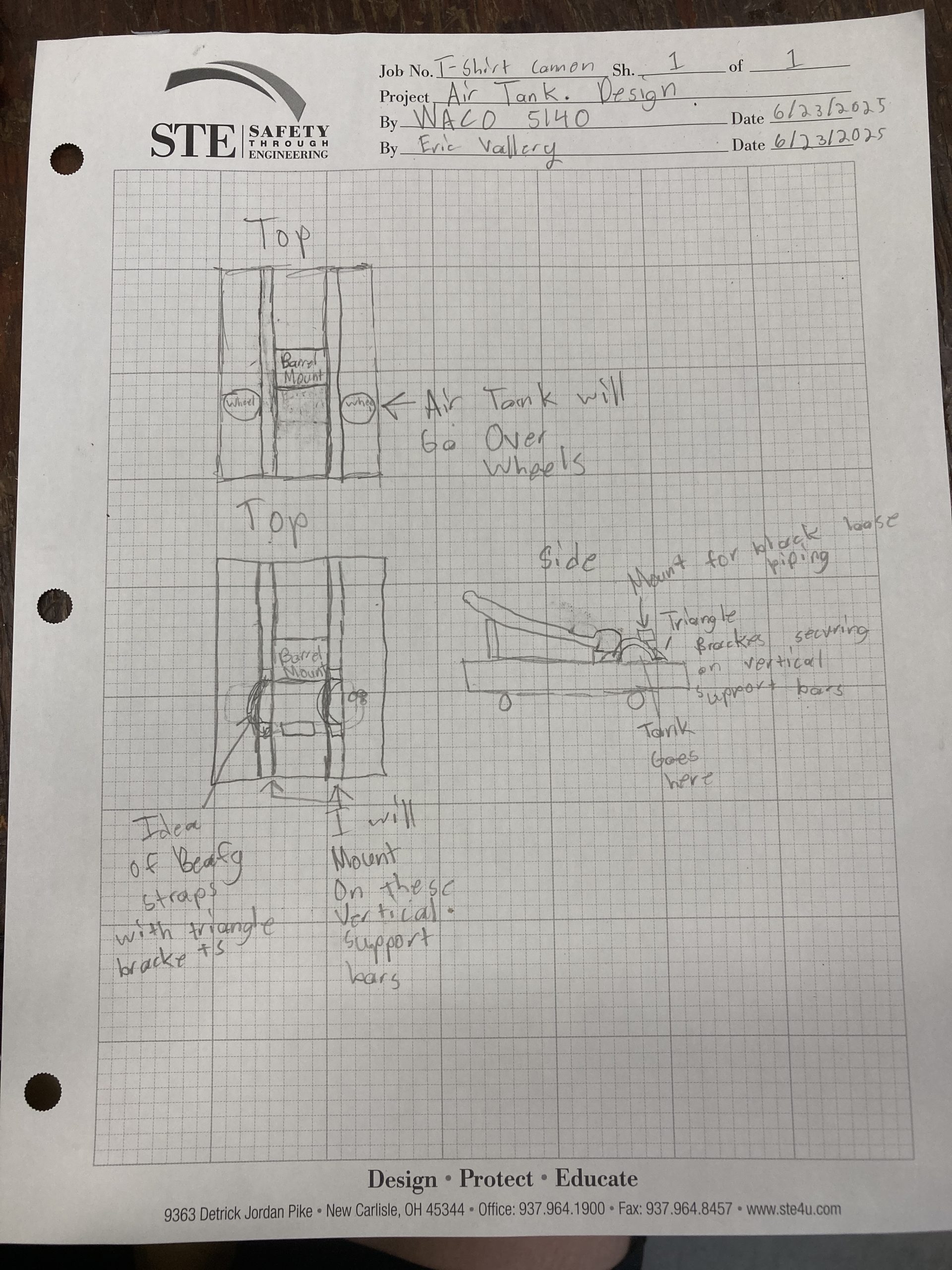 The initial design of the main tank reserve was the beginning of our idea to mount the air tank on the robot. The drawing before the CAD for the air tank. It shows where the air tank will go on the bot. It also shows that the idea was based off of straps with triangle angle brackets for strong support. It also shows that we will have a container for the piping that goes to the air tank. After completing this we would go to On-Shape to draft up a prototype in 3D and eventually send this to a 3D printer.