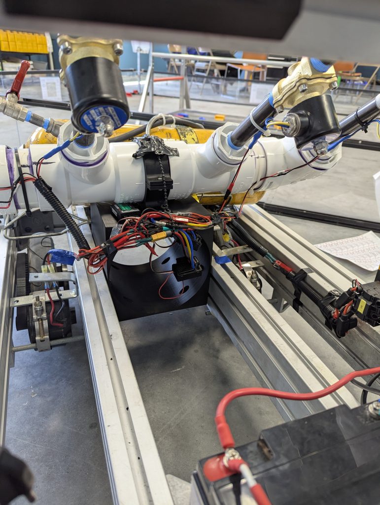 The solution to the problem was using an external accumulator tank that connected to the barrel via solenoid valves. First, we tested this concept with a single barrel, as shown in the image. This ended up being a success and was decided to be used in the final version.